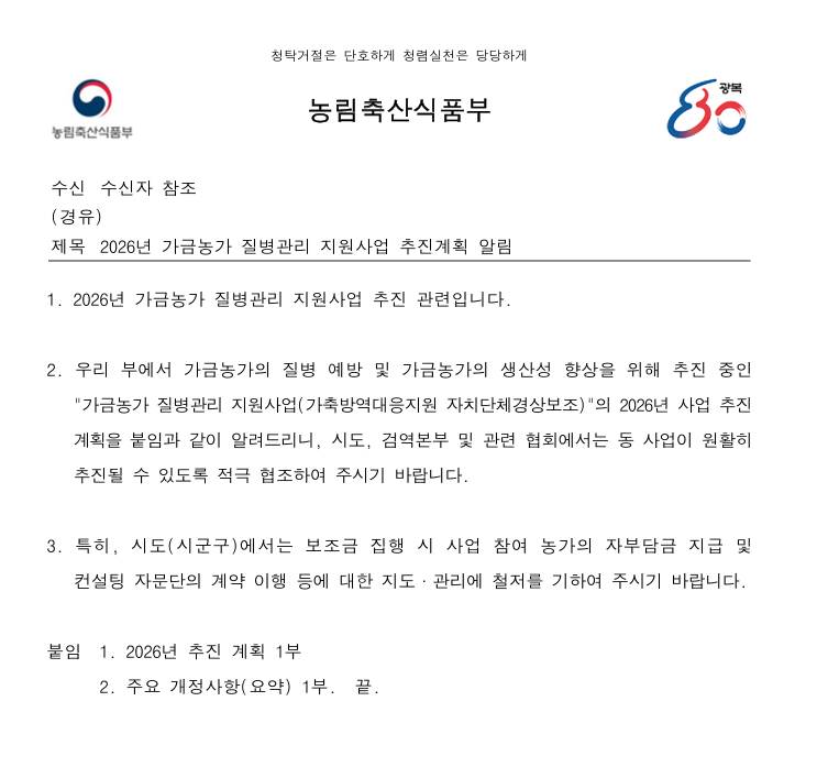 2026년 가금농가 질병관리 지원사업 추진계획 알림