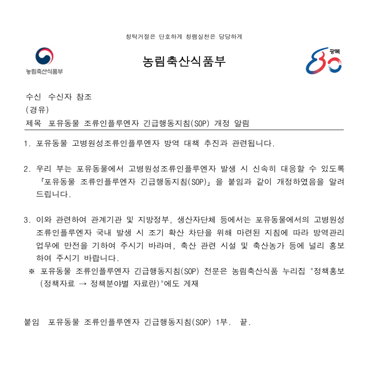 포유동물 조류인플루엔자 긴급행동지침(SOP) 개정 알림