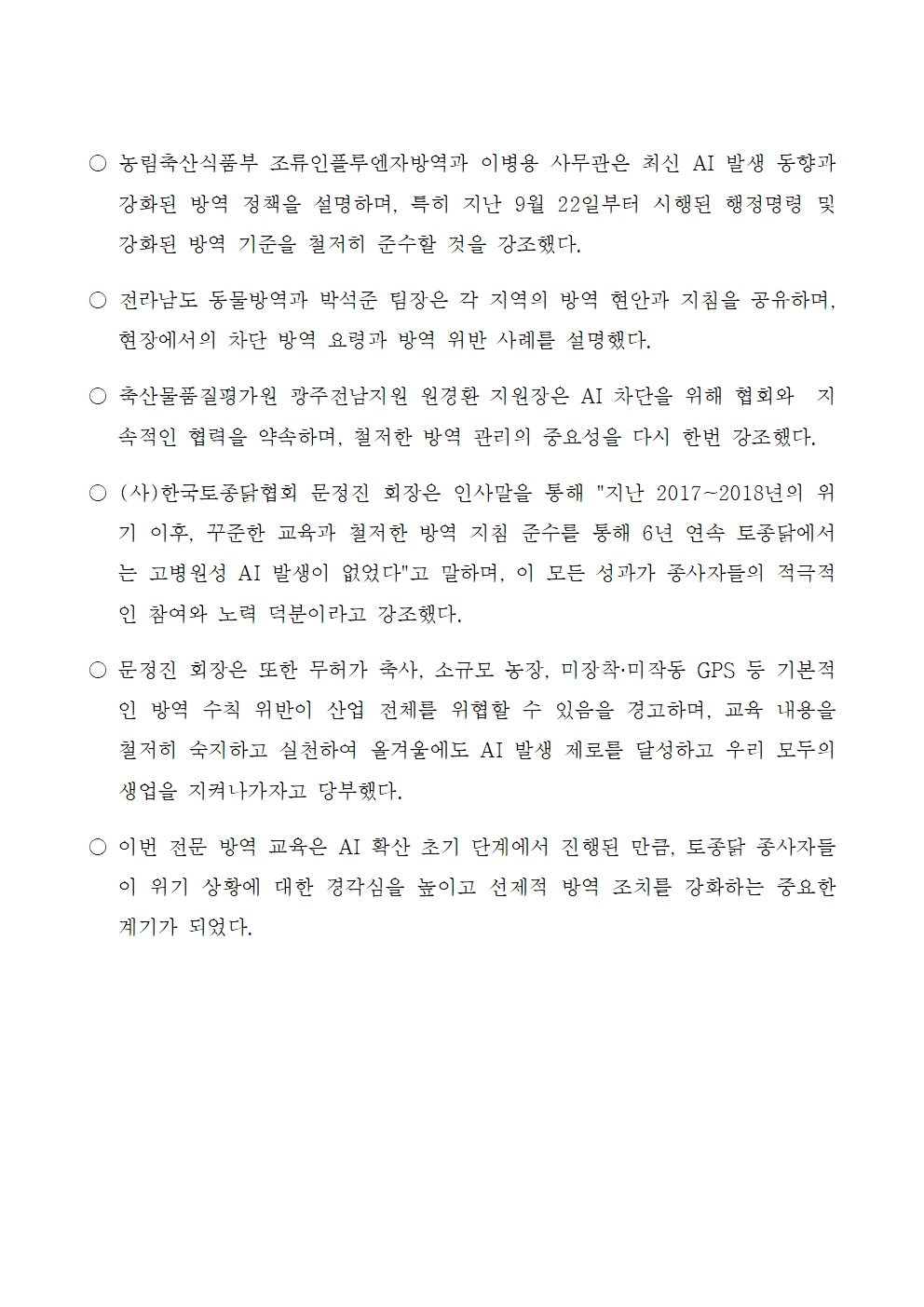 (보도자료) 한국토종닭협회, AI 제로화 위한 '토종닭 종사자 전문 방역 교육' 개최