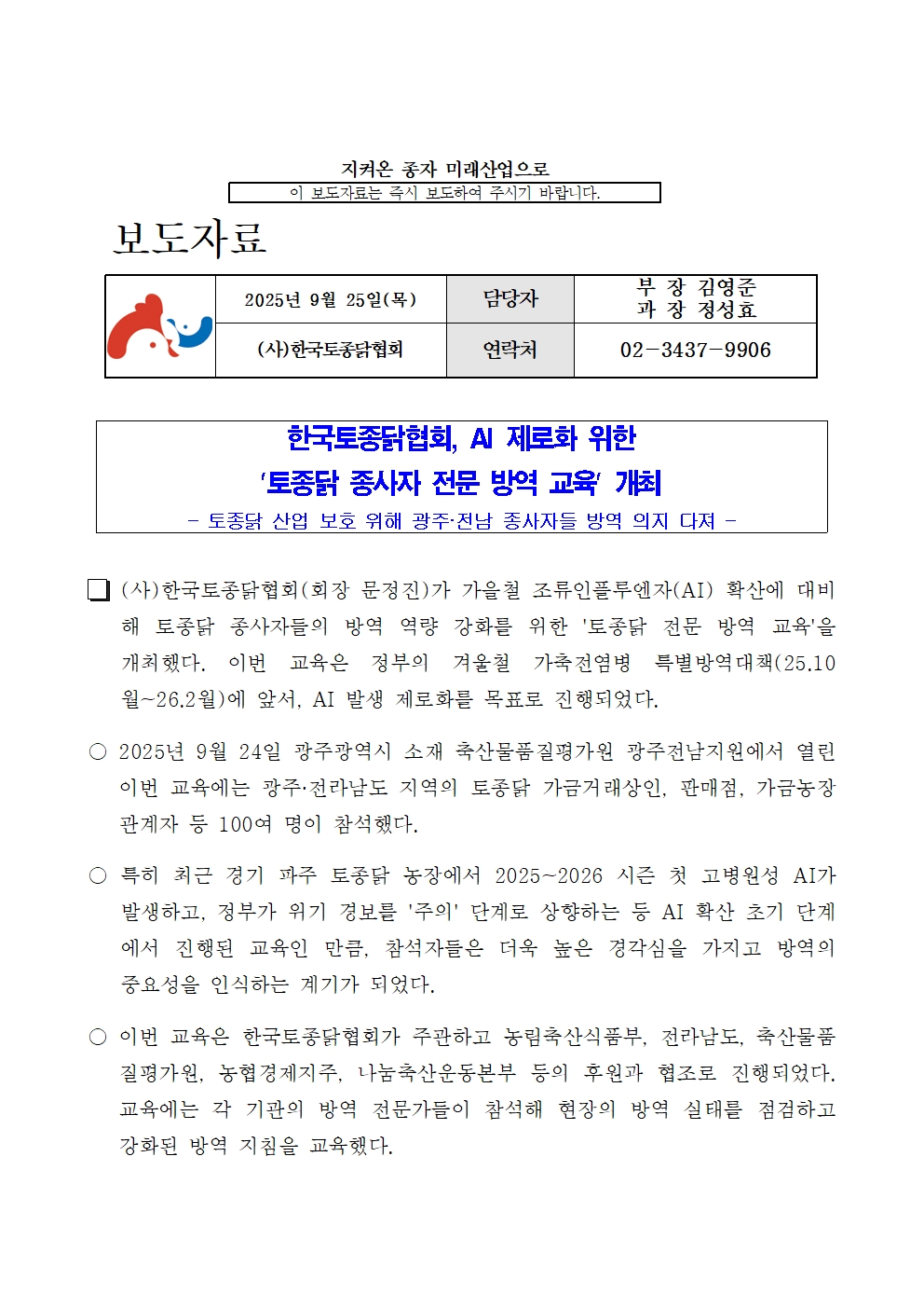 (250924) 한국토종닭협회, ai 제로화 위한 \'토종닭 종사자 전문 방역 교육\' 개최.hwp