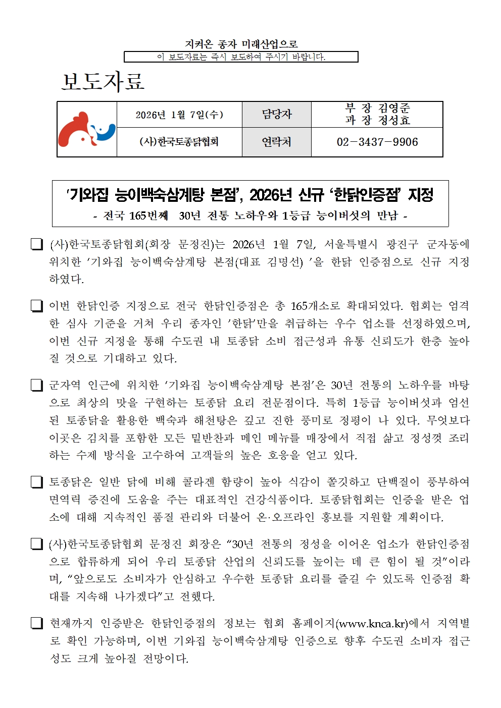 (보도자료) '기와집 능이백숙삼계탕 본점' 2026년 신규 ‘한닭인증점’으로 지정