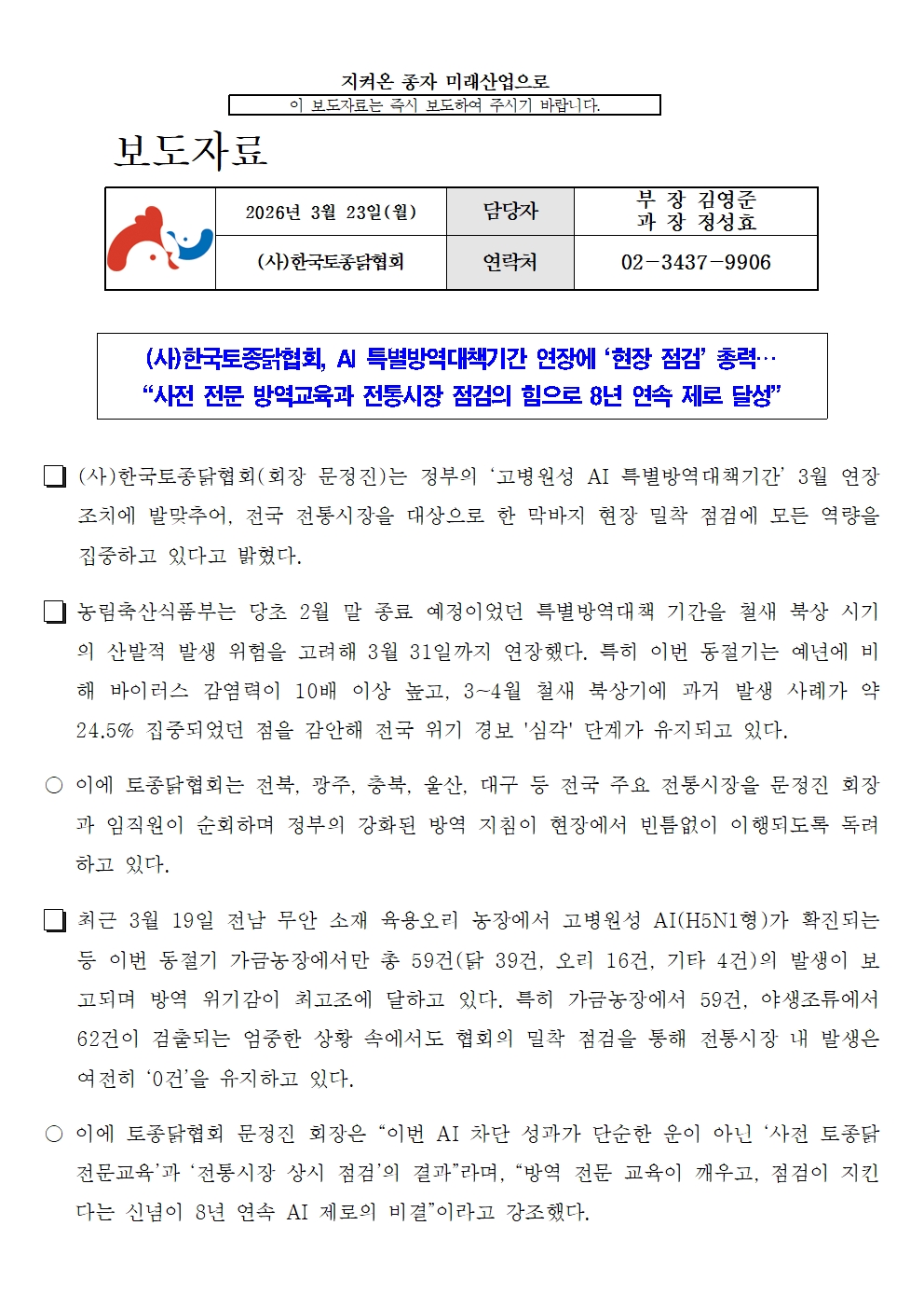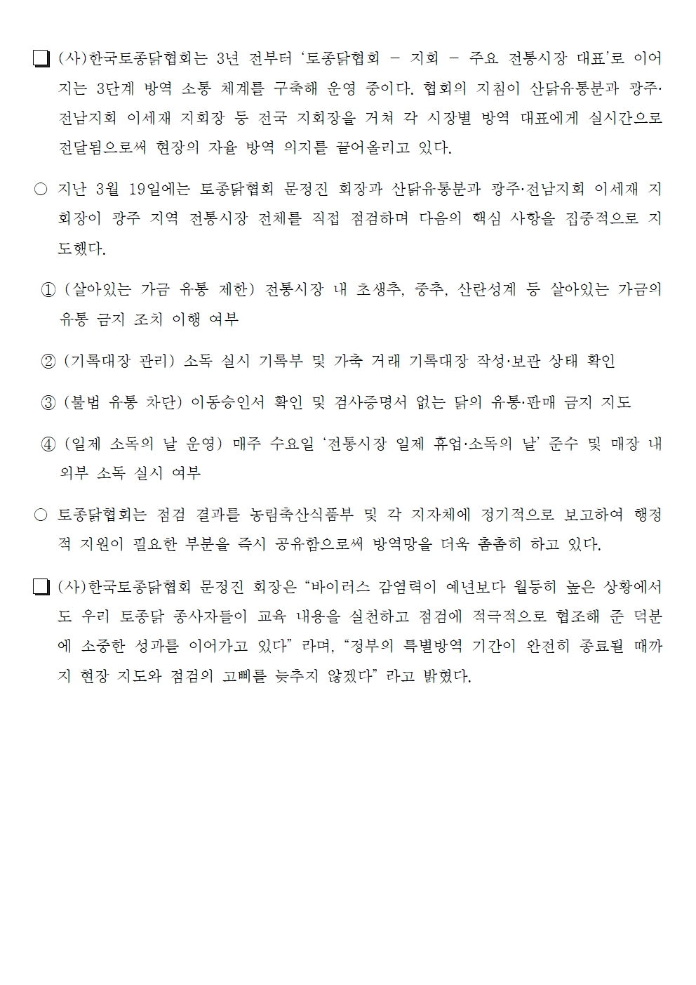 (보도자료) (사)한국토종닭협회, AI 특별방역대책기간 연장에 ‘현장 점검’ 총력…