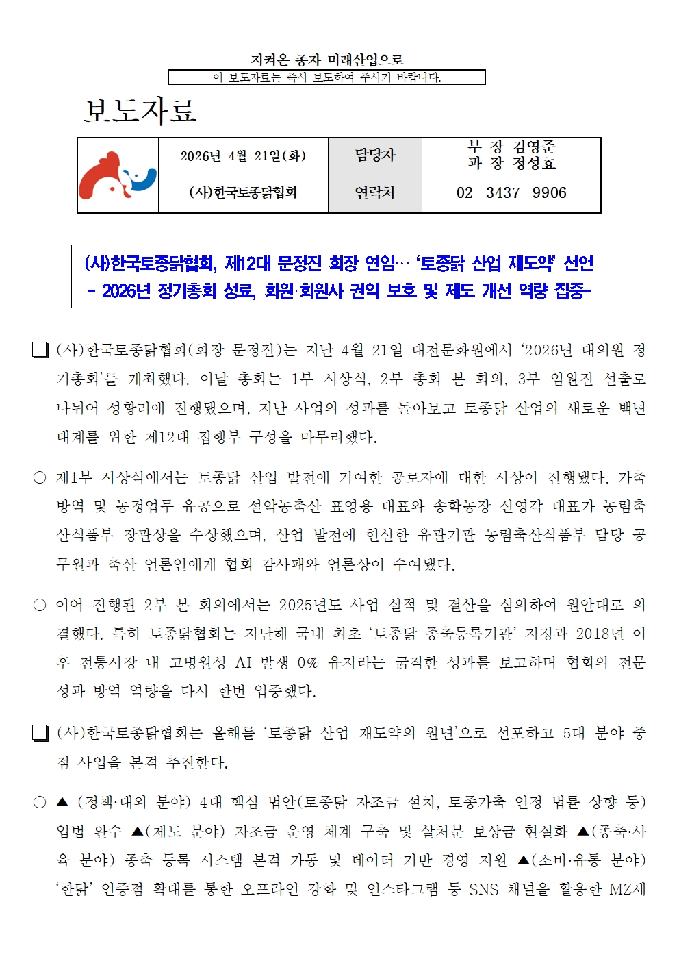 (260421) (사)한국토종닭협회, 제12대 문정진 회장 연임… ‘토종닭 산업 재도약’ 선언.hwp