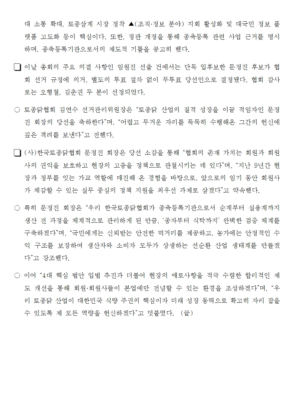(보도자료) (사)한국토종닭협회, 제12대 문정진 회장 연임… ‘토종닭 산업 재도약’ 선언