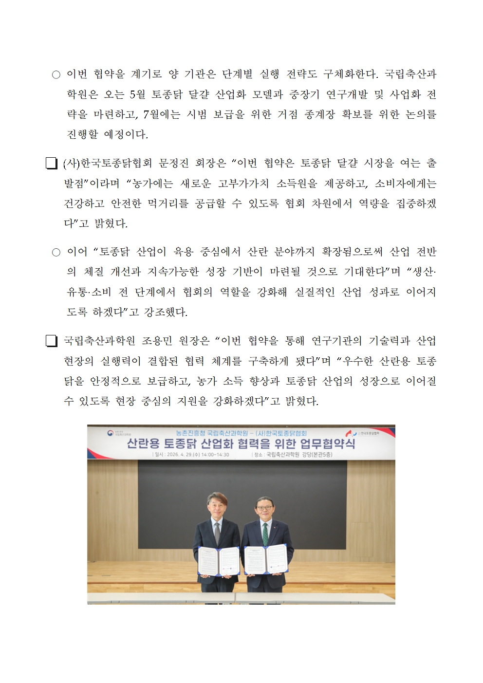 (보도자료) (사)한국토종닭협회-국립축산과학원 산란용 토종닭 개발 보급 확대를 위한 업무협약 체결