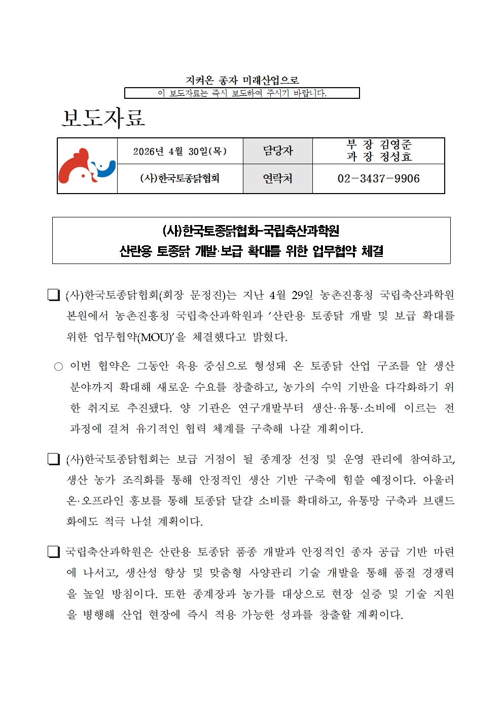 (260430) (사)한국토종닭협회-국립축산과학원 산란용 토종닭 개발 보급 확대를 위한 업무협약 체결.hwp